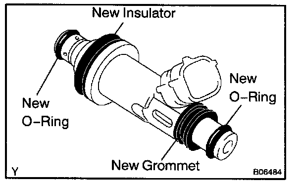 b. Apply a light coat of spindle oil or gasoline to 2 new O-rings and install them to each injector.