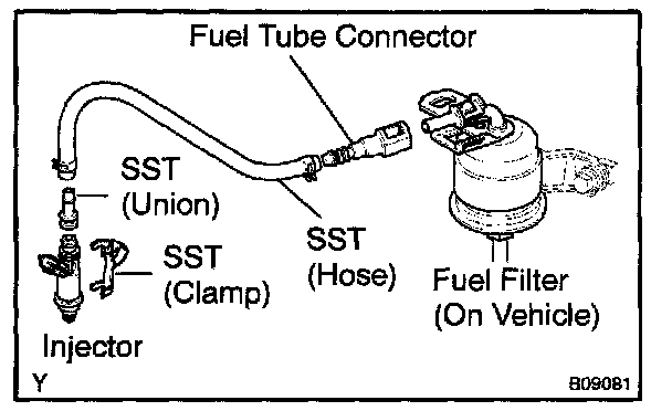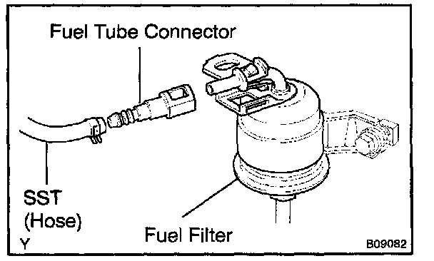 b. Connect SST (hose) and fuel tube connector to the fuel filter outlet.