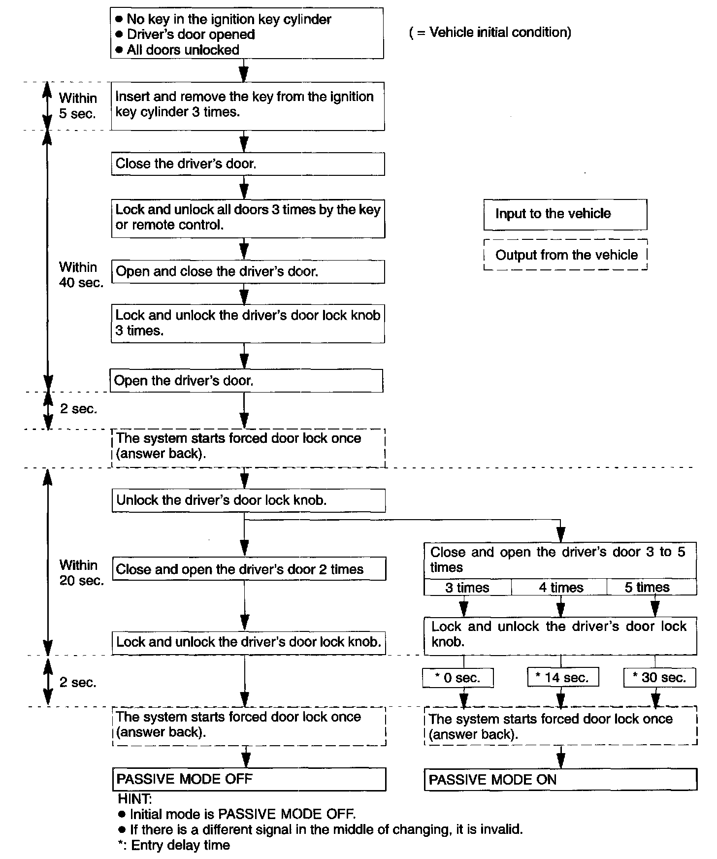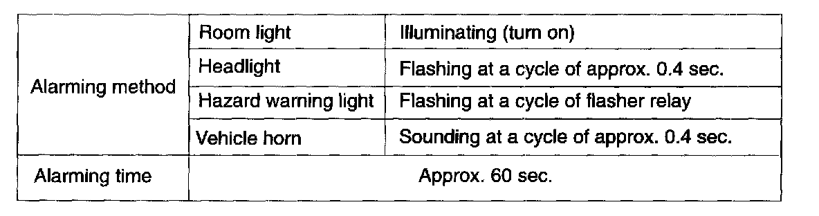 HINT: The theft deterrent system has 2 modes; one is the active mode that is an initially set mode and another is the passive mode that can be switched ON/OFF by the specified method (See step 4).