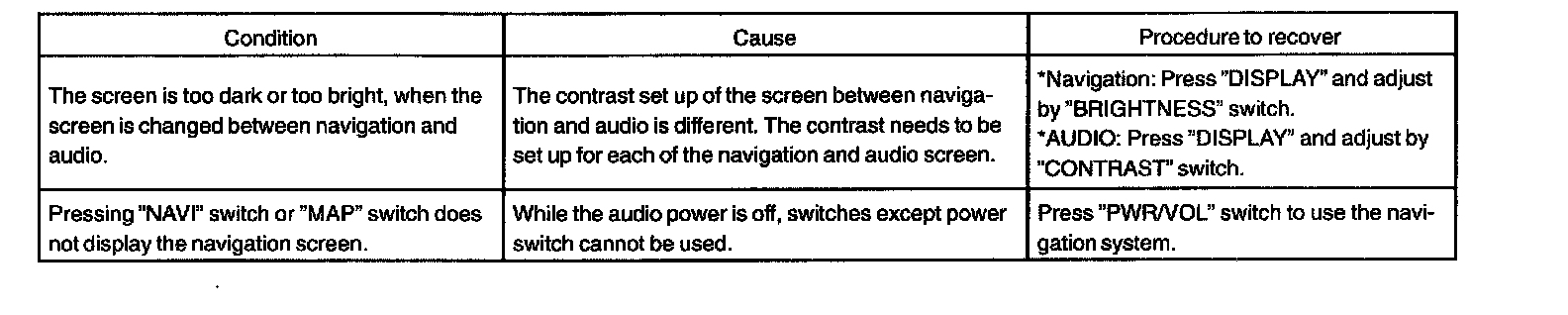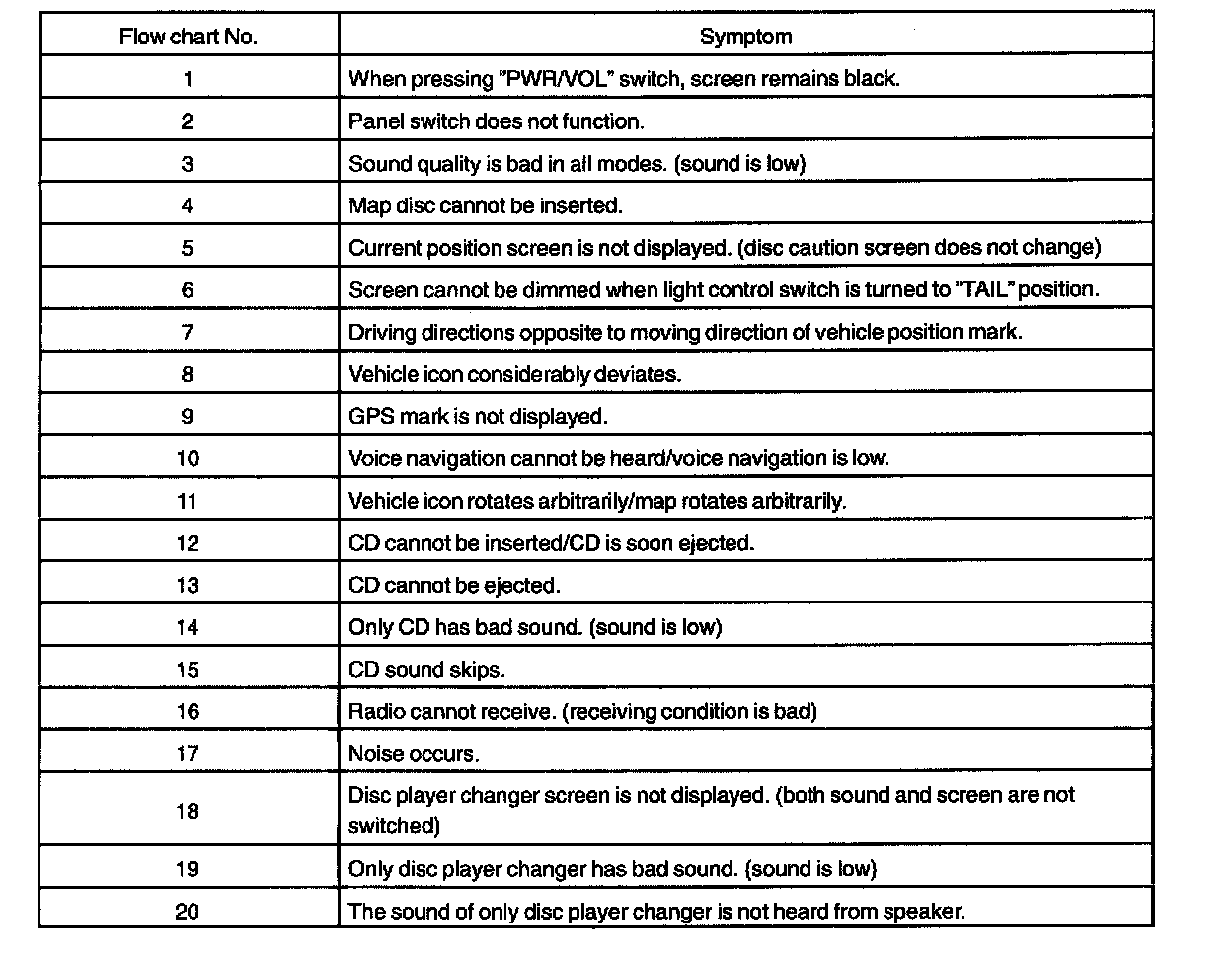 PROBLEM SYMPTOMS TABLE