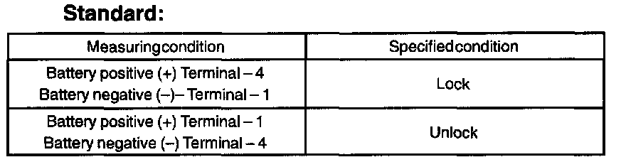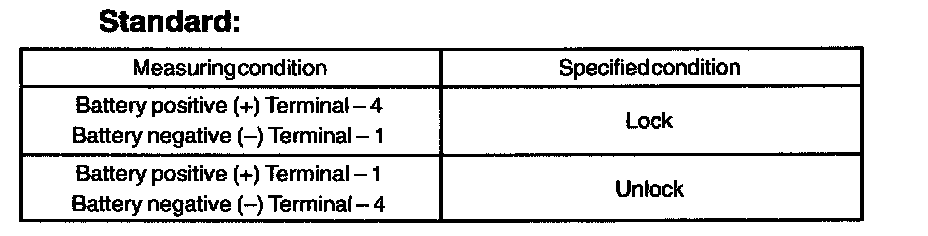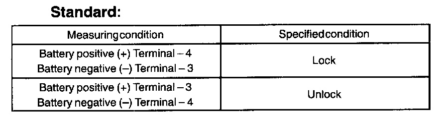 a. Apply battery voltage and inspect the door lock motor operation, as show in the illustration and table.