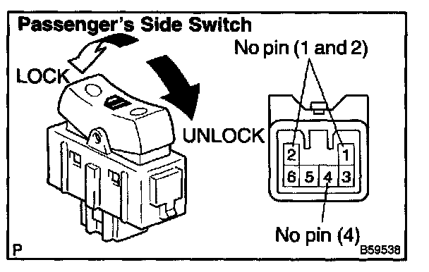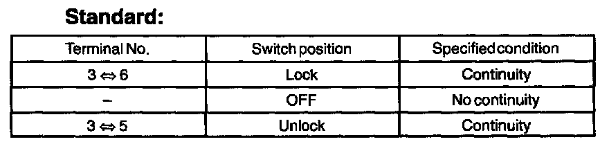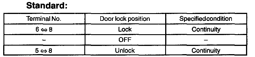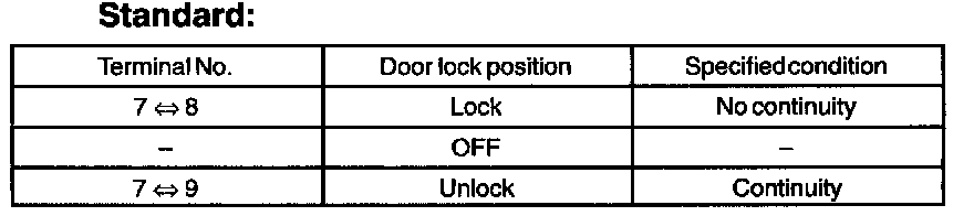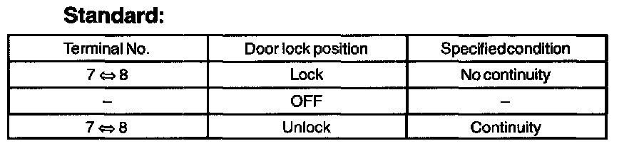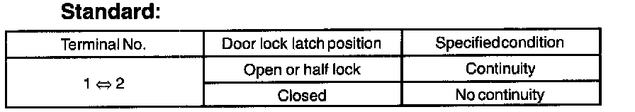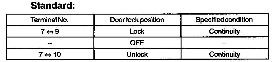 Inspect the door lock control switch continuity, as show in the illustration and table.