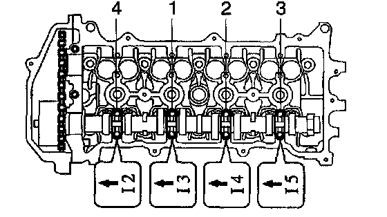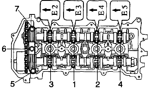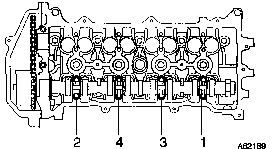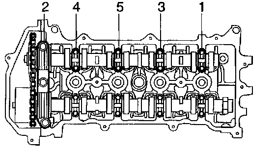 g. Loosen the camshaft bearing cap bolts on camshaft in the order as shown in the illustration in several passes, and remove the caps.