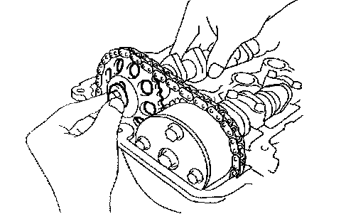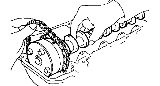 CAUTION: Be sure not to turn the camshaft timing gear to the retard angle side (to the right angle).