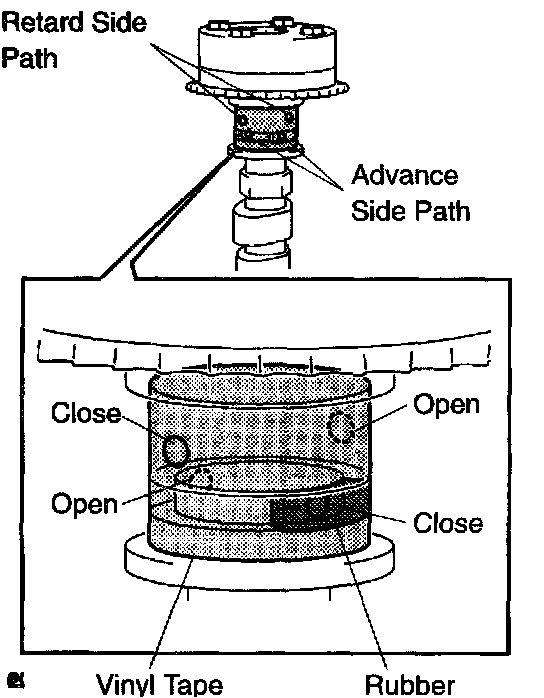 HINT: Two advance side paths are provided in the groove of the camshaft. Plug one of the path with a rubber piece.