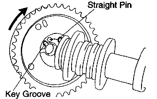 b. Turn the camshaft timing gear assembly to the left direction (as shown in the illustration) with pushing it lightly against the camshaft. Push further at the position where the pin gets into the groove.