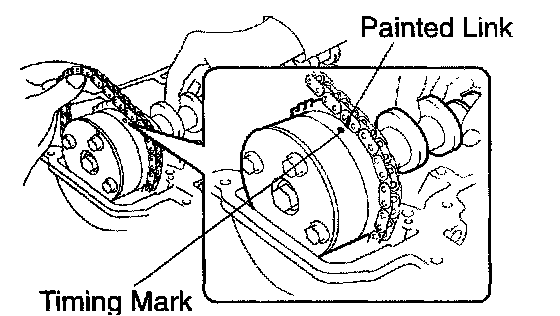 h. Check the match marks on the timing chain and camshaft timing sprockets, and then the alignment of the pulley groove with timing mark of the chain cover as shown in the illustration.