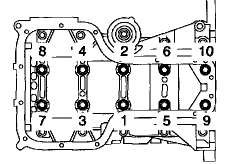 j. Uniformly loosen the 10 bearing cap bolts, in several passes, in the sequence shown in the illustration.