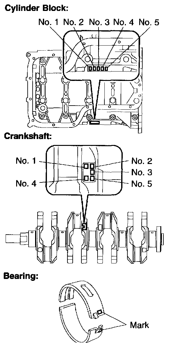 HINT: If replacing a bearing, select a new one having the same number. If the number of the bearing cannot be determined, calculate the correct use bearing number by adding together the numbers imprinted on the cylinder block and crankshaft, then select a new bearing having the calculated number. There are 4 sizes of standard bearings, marked "1", "2", "3" and "4" accordingly.