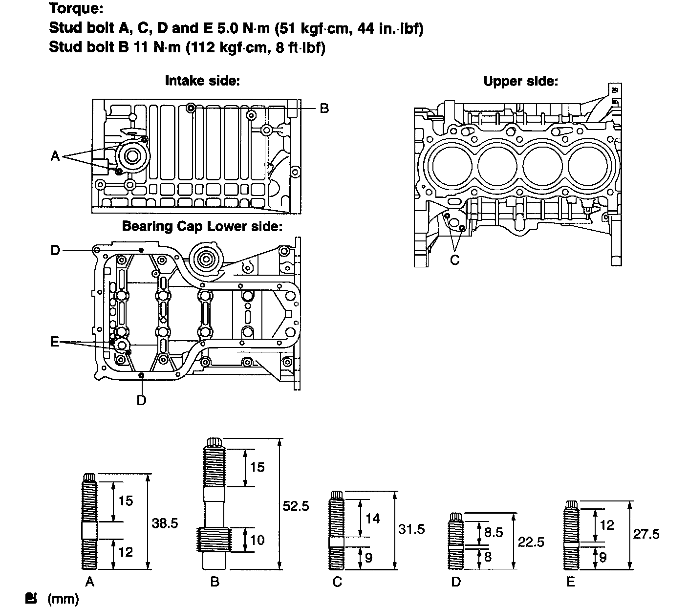 Stud bolt A, C, D and E 5.0 Nm (51 kgf-cm, 44 inch lbs.)