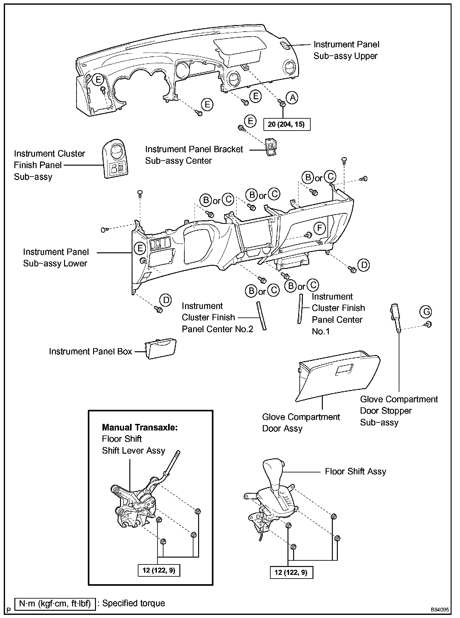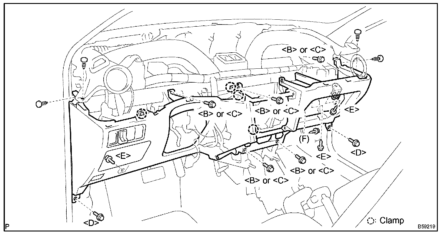 HINT: Indicate the bolts, screws and nuts, which are necessary for installation and removal of the instrument panel, in the illustration and the text with alphabets.