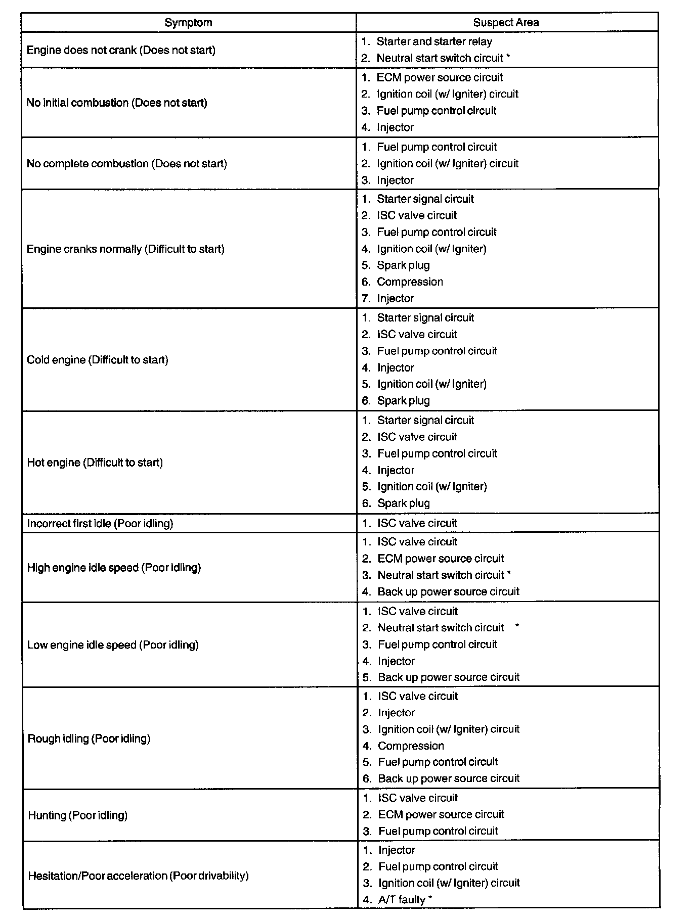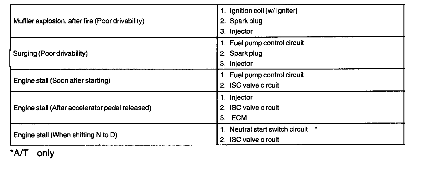 When the malfunction code is not confirmed in the diagnostic trouble code check and the problem still can not be confirmed in the basic inspection, proceed to this problem symptoms tables and troubleshoot according to the numbered order.