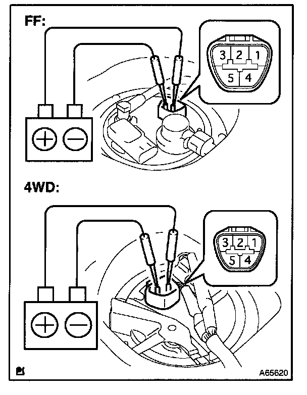 5. If you have no hand-held tester, connect the positive (+) and negative (-) leads from the battery to the fuel pump connector
