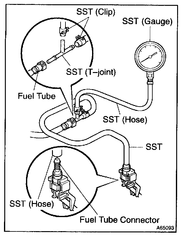 e. Install SST (pressure gauge) as shown in the illustration by using the SST and fuel tube connector.