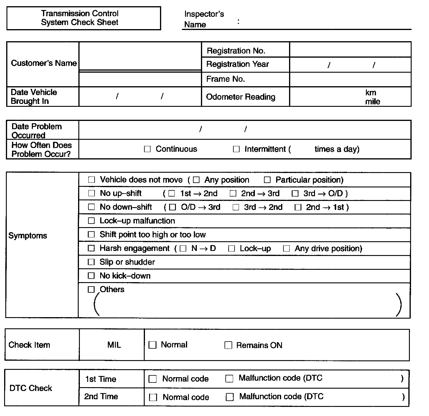 Transmission Control System Check Sheet: