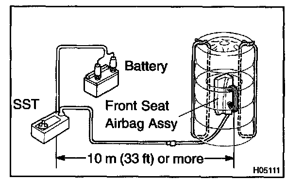 DISPOSALHINT: When scrapping vehicles equipped with an SRS or disposing of the front seat airbag assy always first deploy the airbag in accordance with the procedure described below. If any abnormality occurs with the airbag deployment, contact the SERVICE DEPT. of TOYOTA MOTOR SALES, U.S.A., INC.