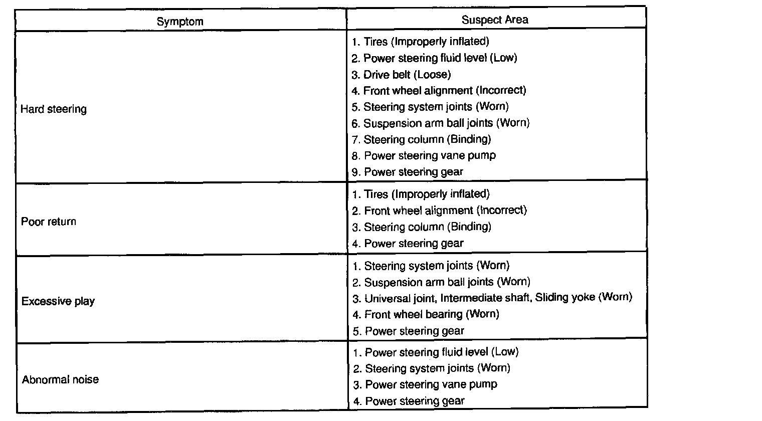 Use the table to help you find the cause of the problem. The numbers indicate the priority of the likely cause of the problem. Check each part in order. If necessary, repair or replace these parts.