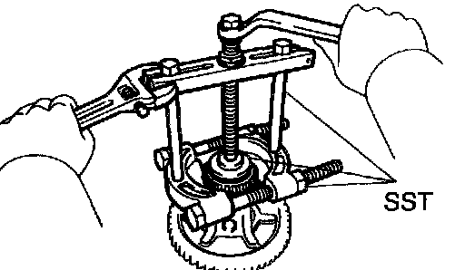 c. Using SST and a torque wrench, turn the differential case assy to the right and left 2 or 3 times to allow the bearings to settle.