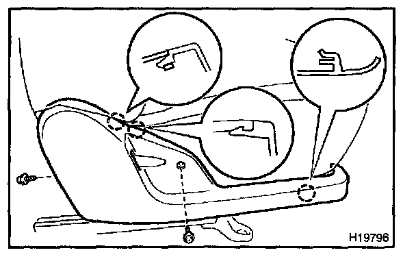e. Remove the hog rings, 4 bolts and seat back assy.