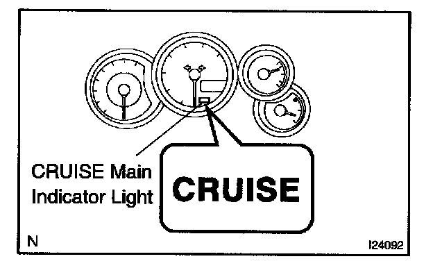 2. Check that the CRUISE main indicator light comes on when the cruise control main switch button is turned ON, and that the indicator light goes off when the main switch button is turned OFF.