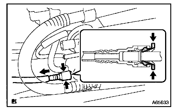 - When the fuel tube connector and pipe are stuck, pinch the fuel emission tube between fingers, and turn it carefully to free and then disconnect the fuel emission tube.