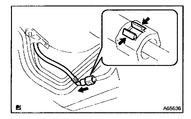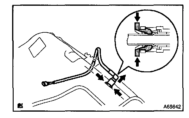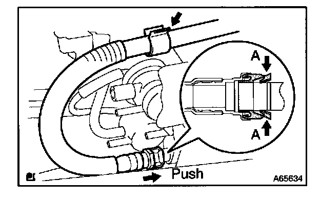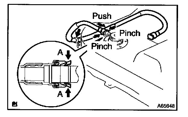 Pinch the fuel tube connector clip and then pull out the fuel evaporation tube.