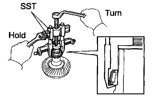 f. Using SST and a press, press the ring gear mounting case bearing LH outer race into the case.