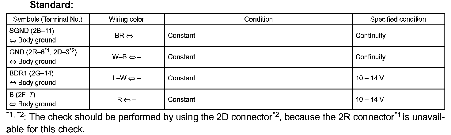 a. Disconnect the 2B, 2F and 2G instrument panel J/B connectors, and check the continuity and voltage of each terminal of the disconnected connectors.