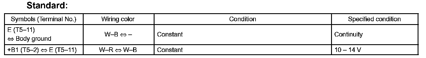 a. Disconnect the T5 theft warning ECU (theft deterrent ECU) connector and check the voltage and continuity of each terminal of the wire harness side connector.