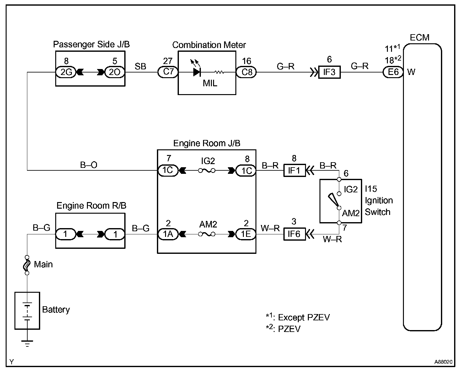 The Malfunction Indicator Lamp (MIL) is used to indicate the ECM's detection of a vehicle malfunction. The instrument panel IG2 fuse provides circuit power and the ECM provides the circuit ground that illuminates the MIL.