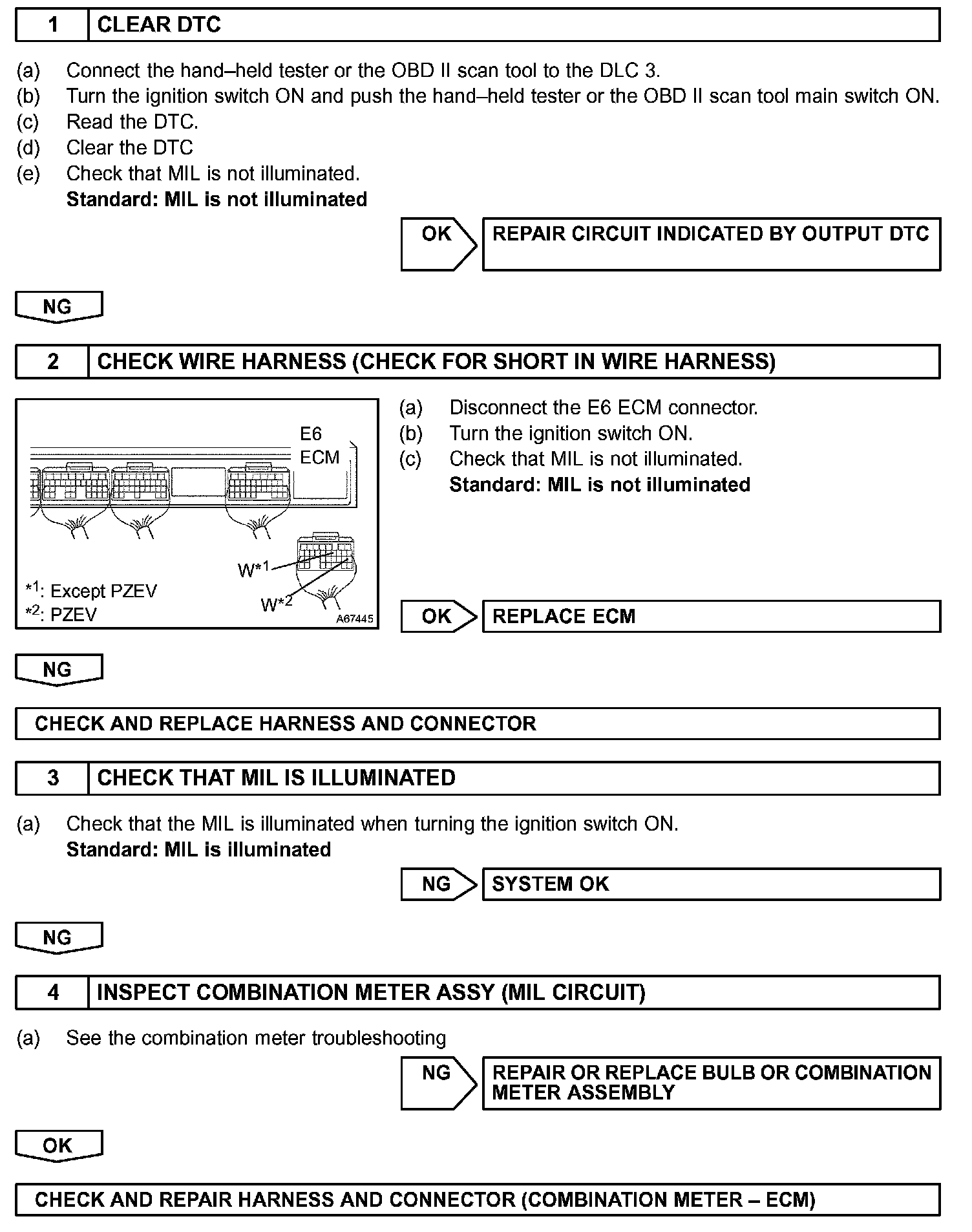 The MIL should be illuminated when the ignition is first turned on. If the MIL is always ON or OFF, use the hand-held tester or OBD II scan tool and follow the procedures below to determine the cause of the problem.