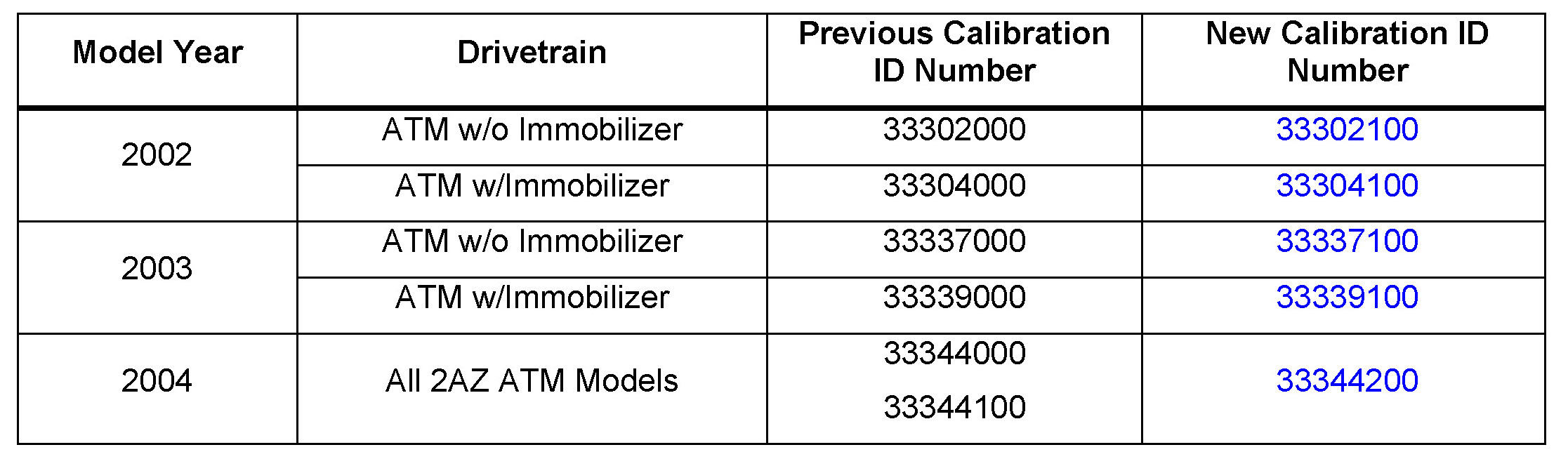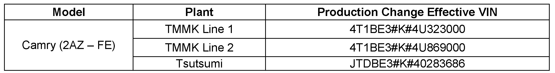 - 2002 - 2004 model year Camry vehicles equipped with the 2AZ-FE engine produced BEFORE the Production Change Effective VINs shown below.