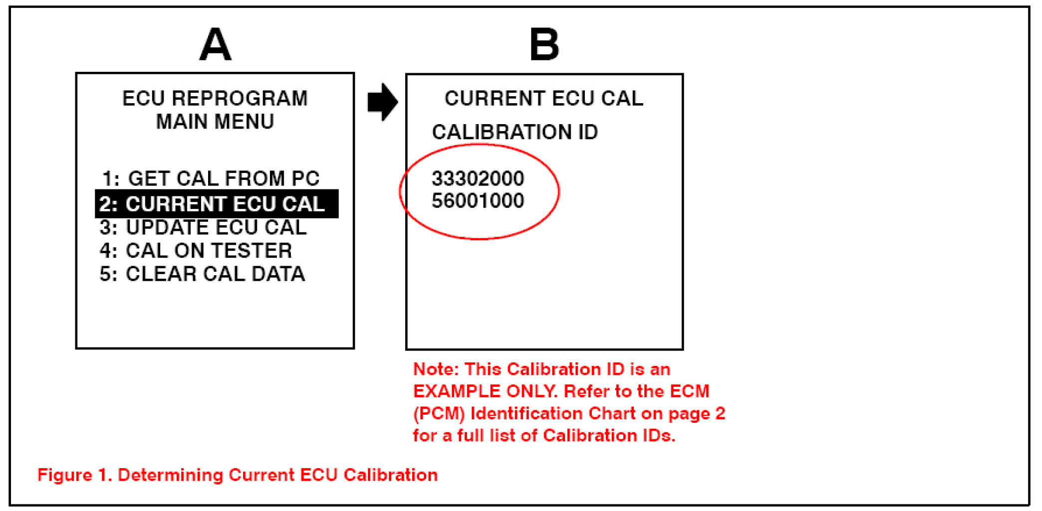 2. Connect the Diagnostic Tester to the vehicle and select "CURRENT ECU CAL" from the "ECU REPROGRAM MAIN MENU." To determine the vehicle's current ECM (PCM) calibration, see Figure 1.