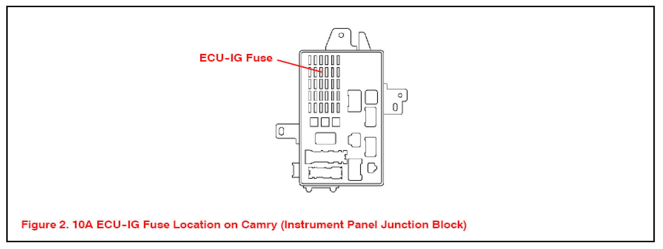 3. Remove the 10A ECU-IG fuse from the instrument panel Junction Block (refer to Figure 2 for location). This action prevents possible activation of the ABS relay, resulting in ECM Reprogramming failure.