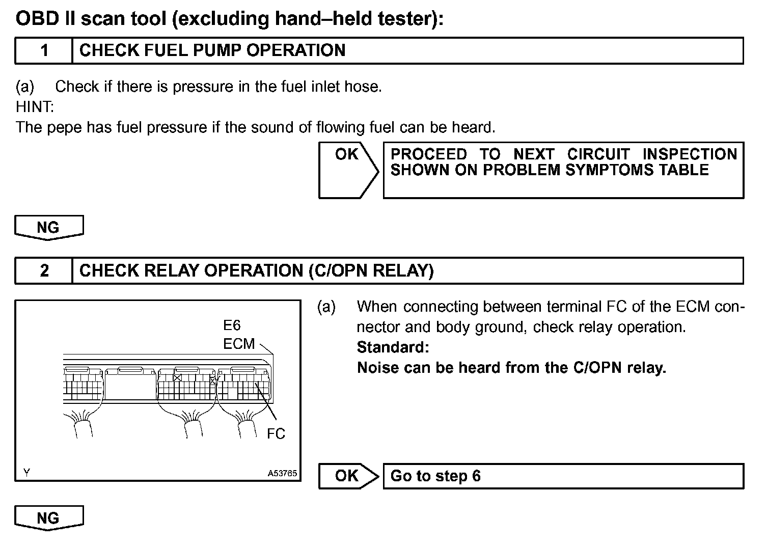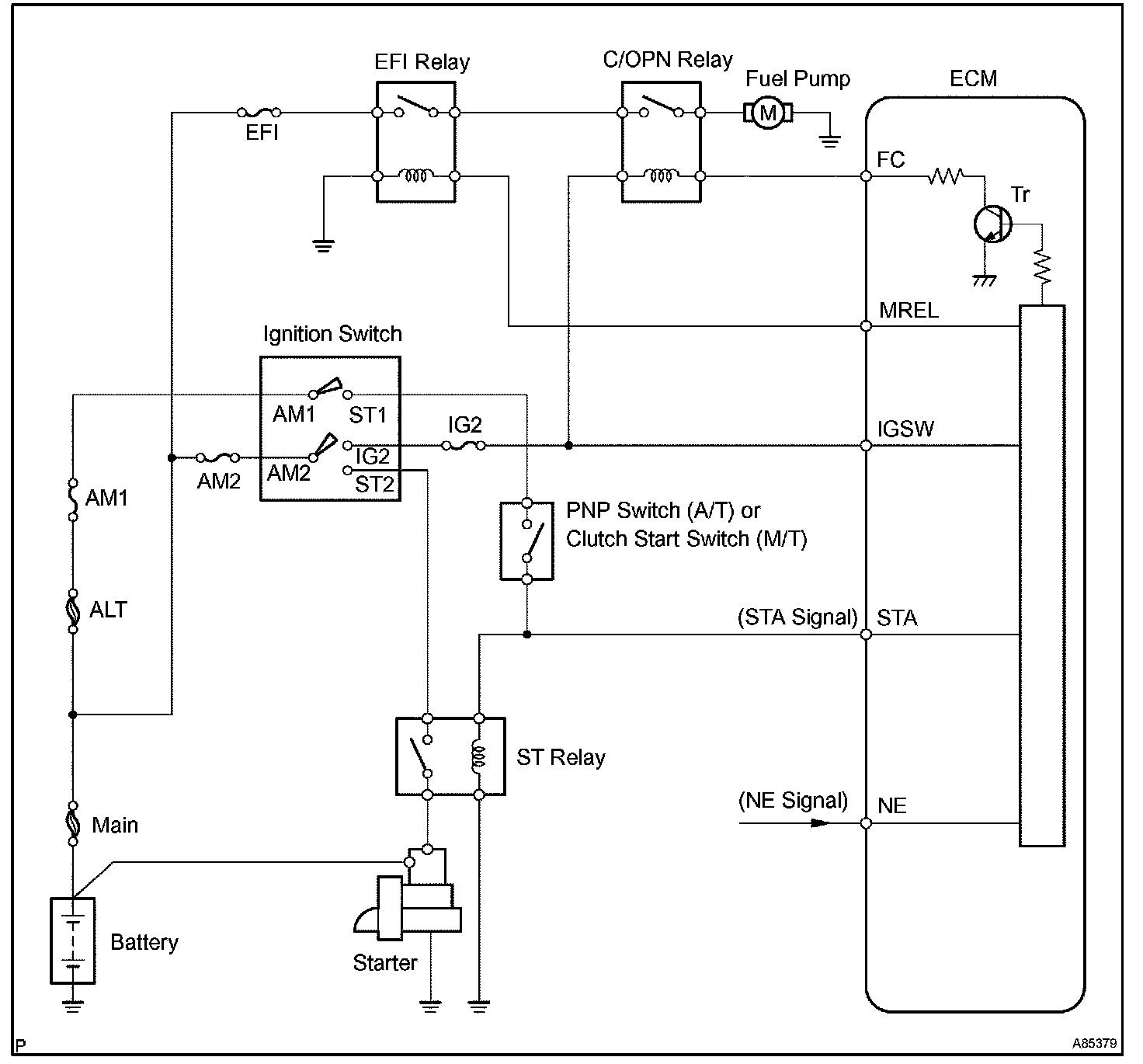 When the STA signal and NE signal are input to the ECM, Tr is turned ON, current flows to coil of the circuit opening relay (Marking: C/OPN), the relay switches on, power is supplied to the fuel pump and the fuel pump operates.
