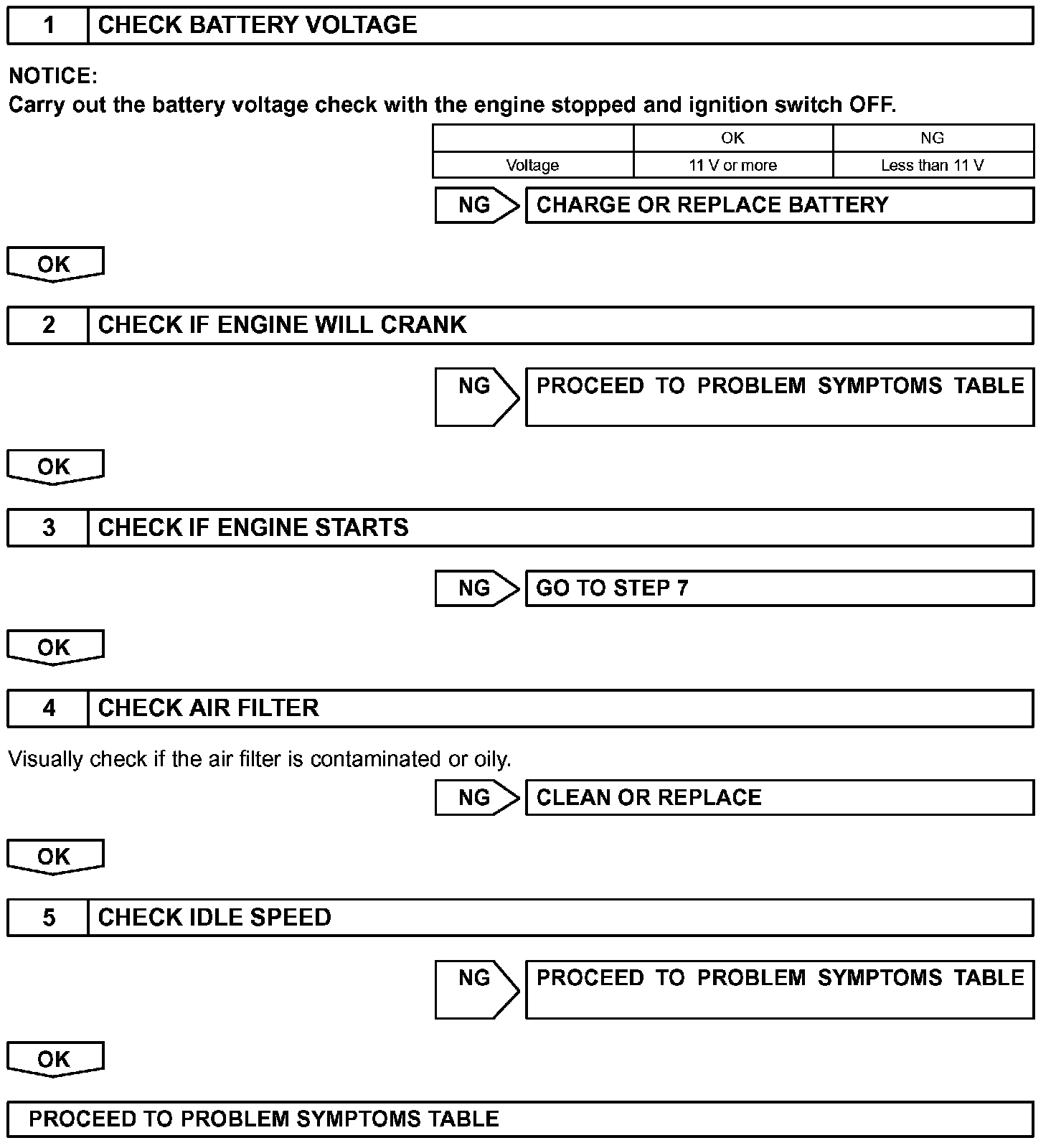 When the malfunction is not confirmed in the DTC check, troubleshooting should be carried out in all the possible circuits considered as possible causes of the problem. In many cases, by carrying out the basic engine check shown in the flowchart, the problem can be found quickly and efficiently. Therefore, using this check is essential in the engine troubleshooting.