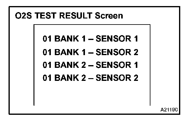 b. On the tester screen, select the following menus: DIAGNOSIS/ CARB OBD II/O2S TEST RESULT. A list of the O2S equipped on the vehicle will be displayed.