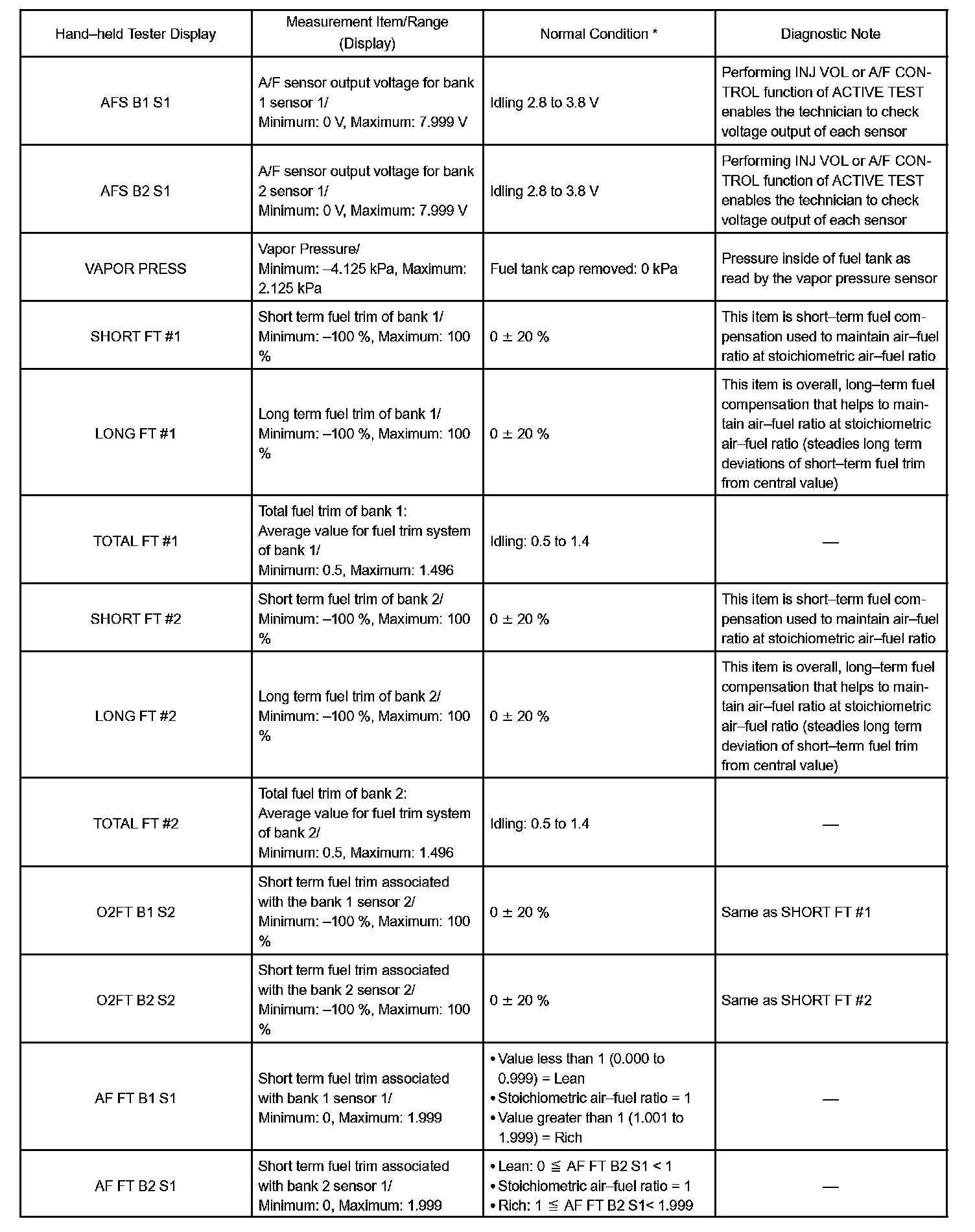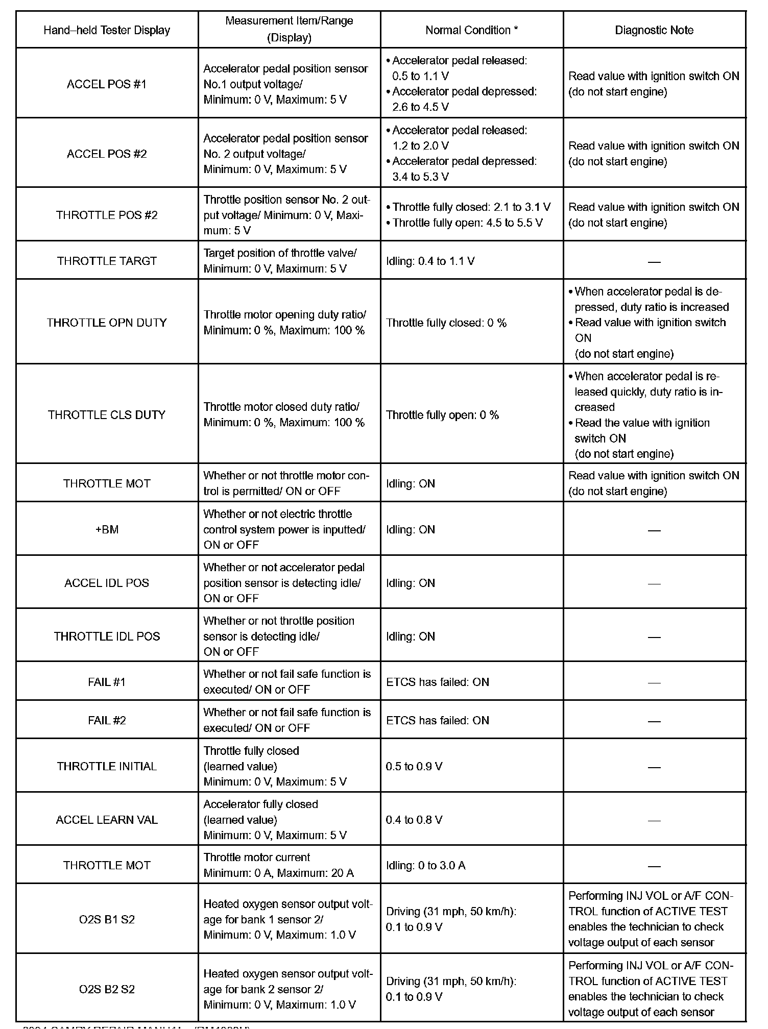 DATA LISTHINT: Using the hand-held tester DATA LIST allows switch, sensor, actuator and other item values to be read without removing any parts. Reading the DATA LIST early in troubleshooting is one way to shorten labor time.