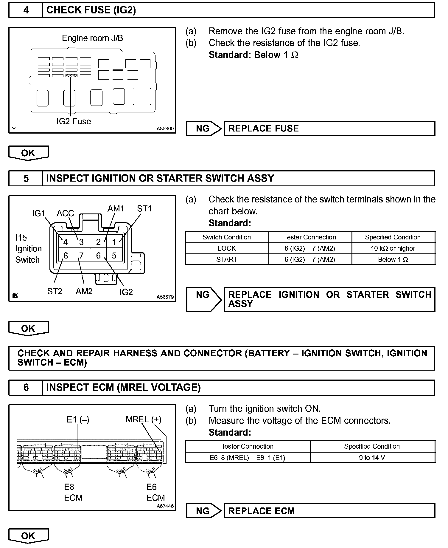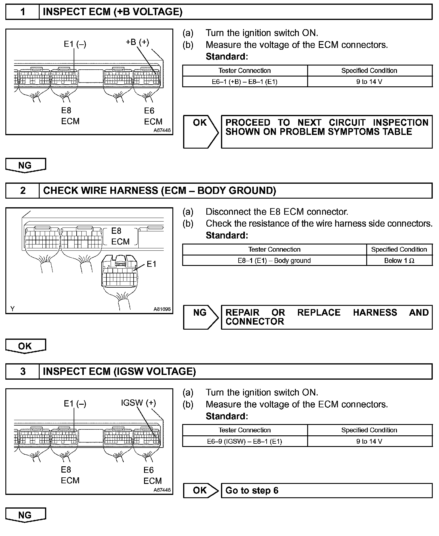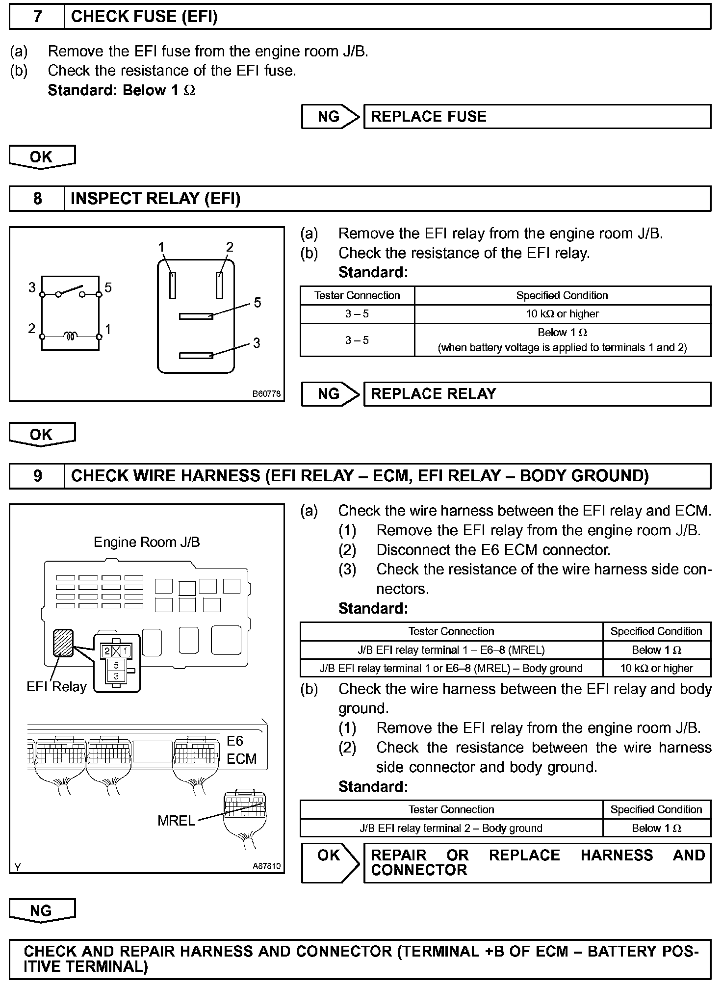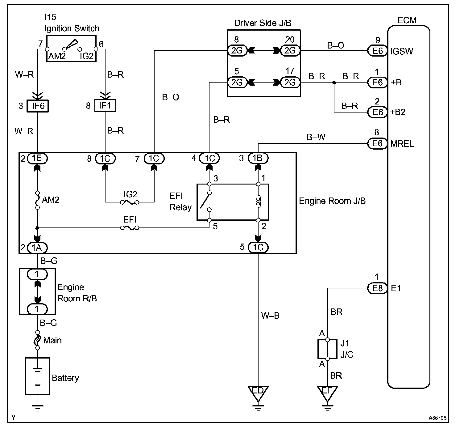 When the ignition switch is turned ON, battery voltage is applied to terminal IGSW of the ECM. The ECM "MREL" output signal causes current to flow to the coil, closing the contacts of the EFI relay (Marked: EFI) and supplying power to terminal +B of the ECM.