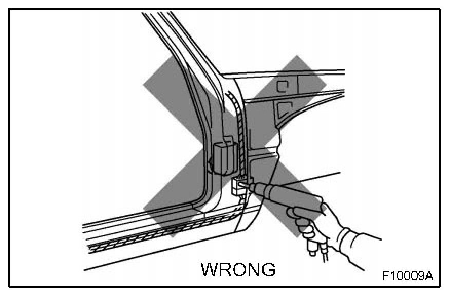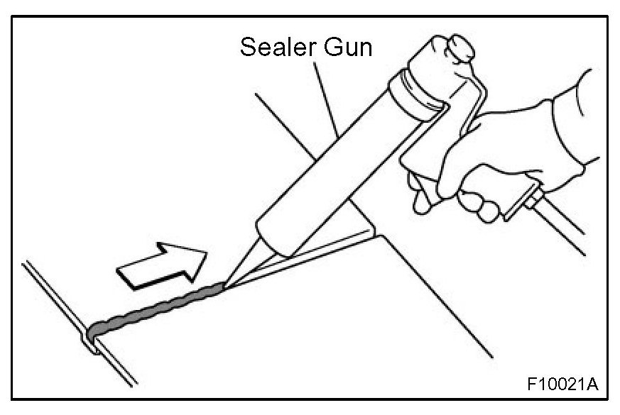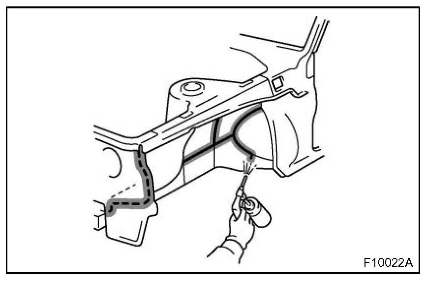 1. For water-proofing and anti-corrosion measures, always apply the body sealer to the body panel seams and hems of the doors, hoods, etc.