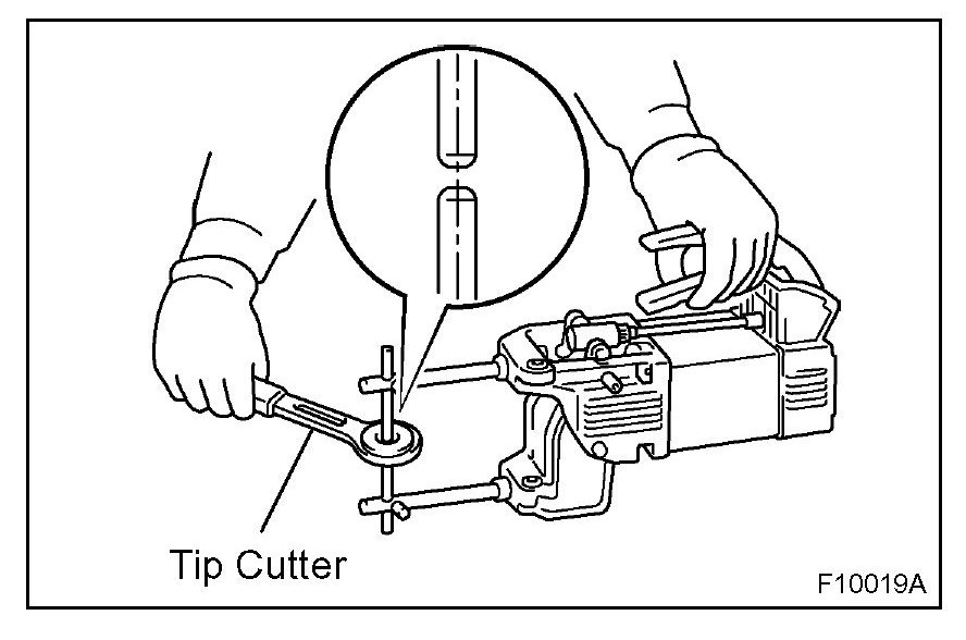 1. When welding panels with a combined thickness of over 3 mm (0.12 in.), use a MIG (Metal Inert Gas) welder for plug welding.
