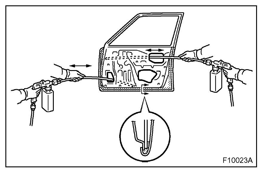 1. To preserve impossible to paint areas from corrosion, always apply sufficient anti-rust agent (wax) to the inside of the hemming areas of the doors and hoods, and around the hinges, or the welded surfaces inside the boxed cross-section structure of the side member, body pillar, etc.