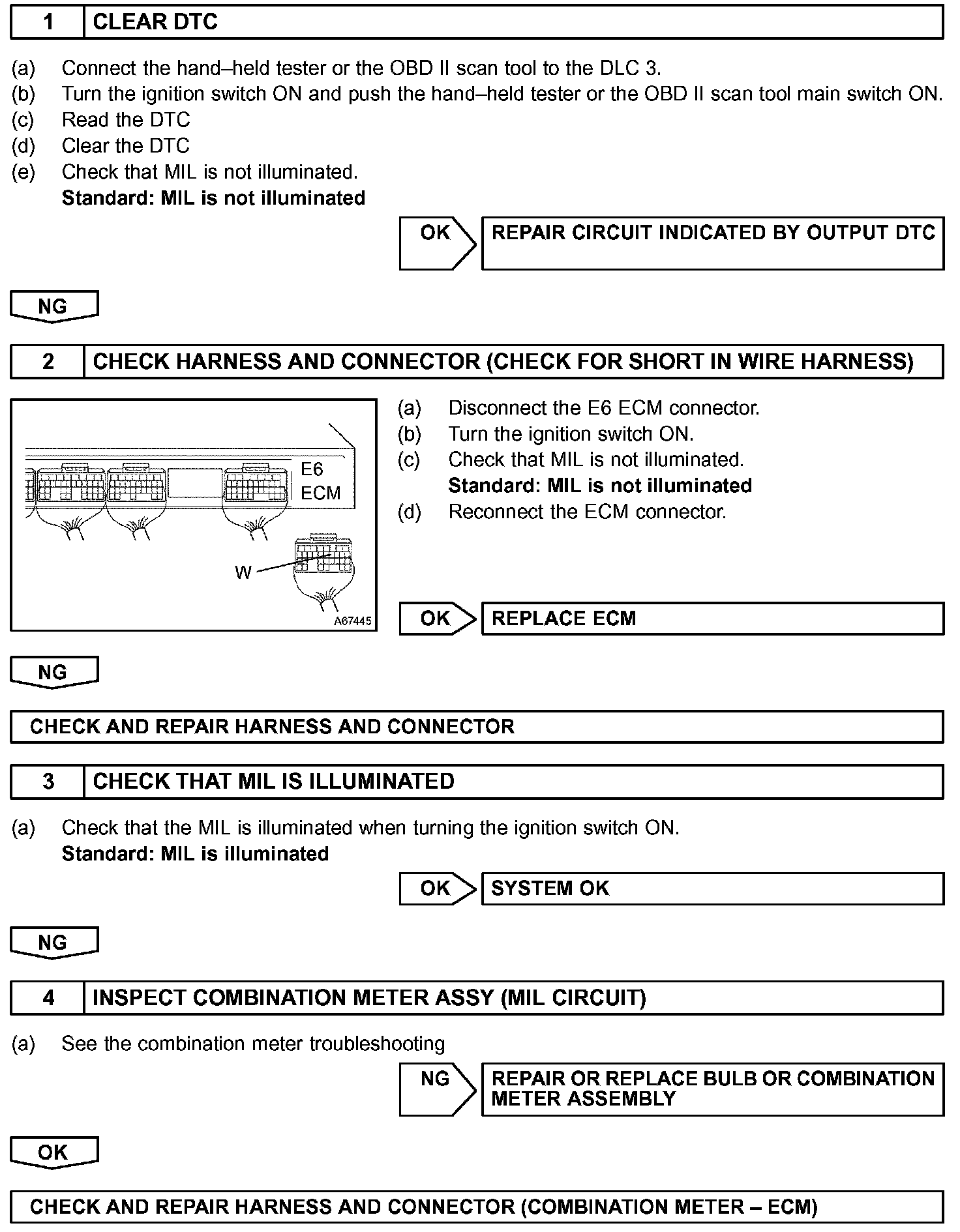 The MIL should be illuminated when the ignition is first turned on. If the MIL is always ON or OFF, use the hand held tester or OBD II scan tool and follow the procedures below to determine the cause of the problem.