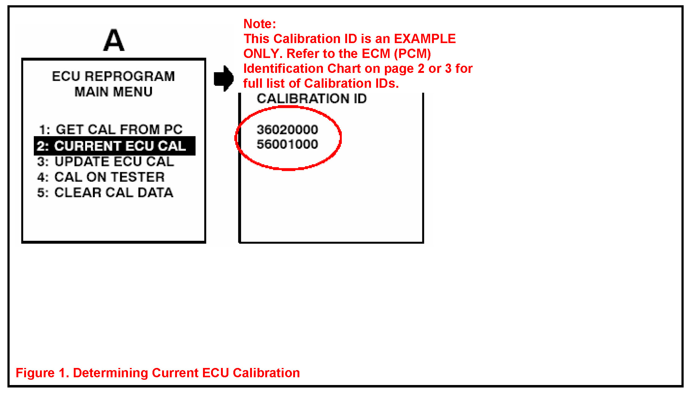 2. Connect the Diagnostic Tester to the vehicle and select "CURRENT ECU CAL" from the "ECU REPROGRAM MAIN MENU." To determine the vehicle's current ECM calibration, Figure 1 shown.