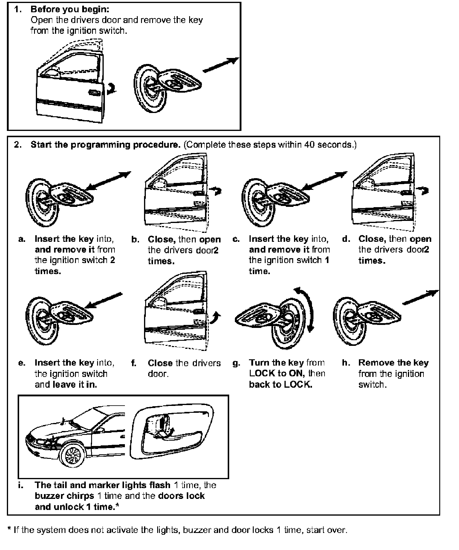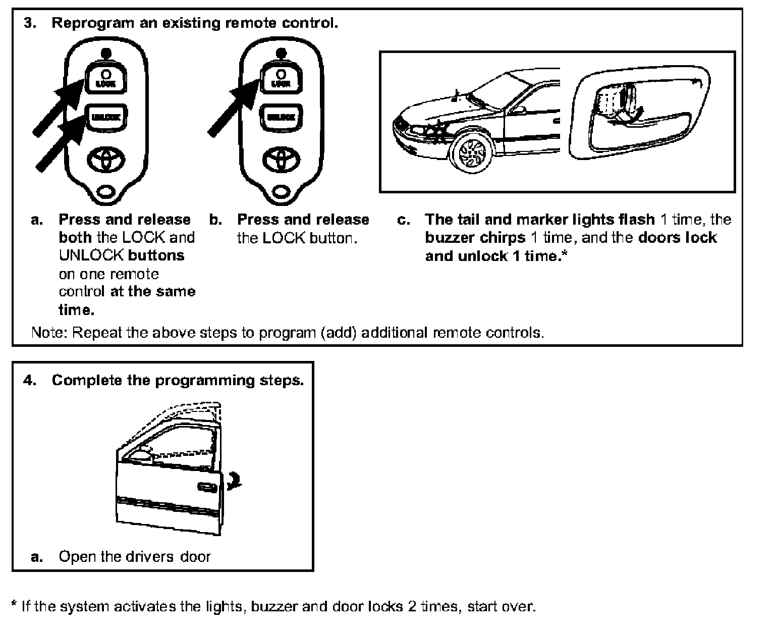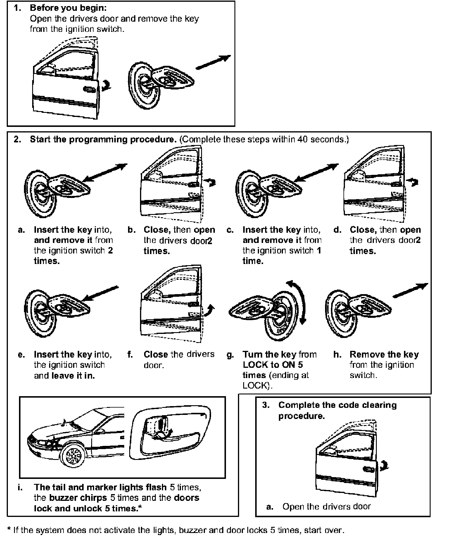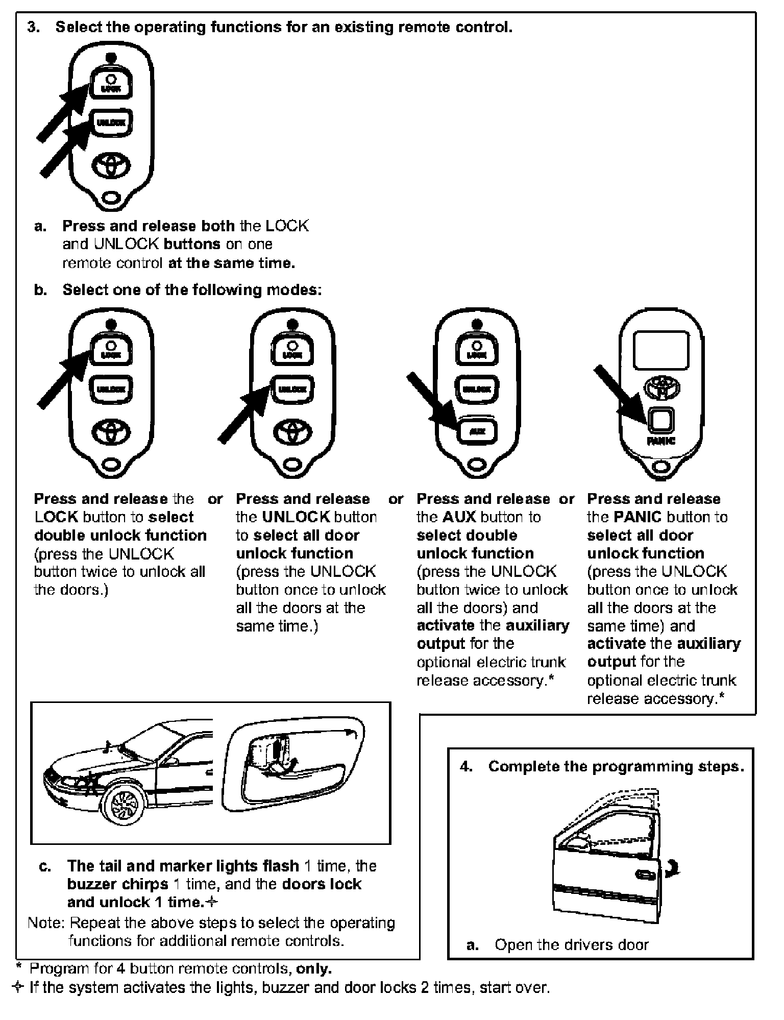 Follow this procedure to clear all existing remote control codes and reprogram existing remote controls to a system. When existing remote controls are reprogrammed, they will work in the default operation mode (press the UNLOCK button twice to unlock all doors and no AUX button function on 4 button remote controls); to change the operation mode, you must perform the separate REMOTE CONTROL FUNCTION SELECT procedure.