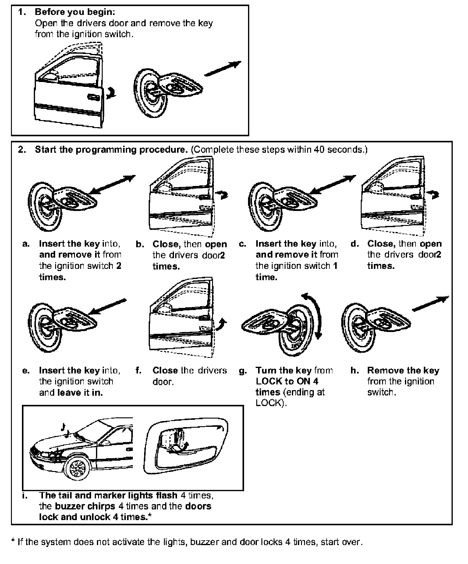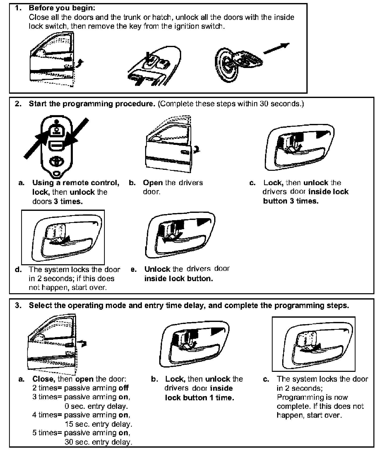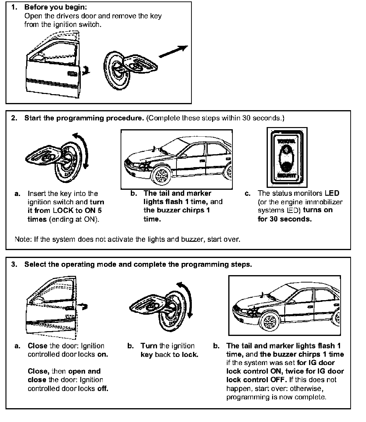 When all doors are closed, the RS3200 is factory set to automatically lock the vehicle's door when the ignition key is turned to ON or START, and unlock them (open or not) when the key is turned back to ACC or LOCK. Follow the procedure below to change this feature's operation mode.