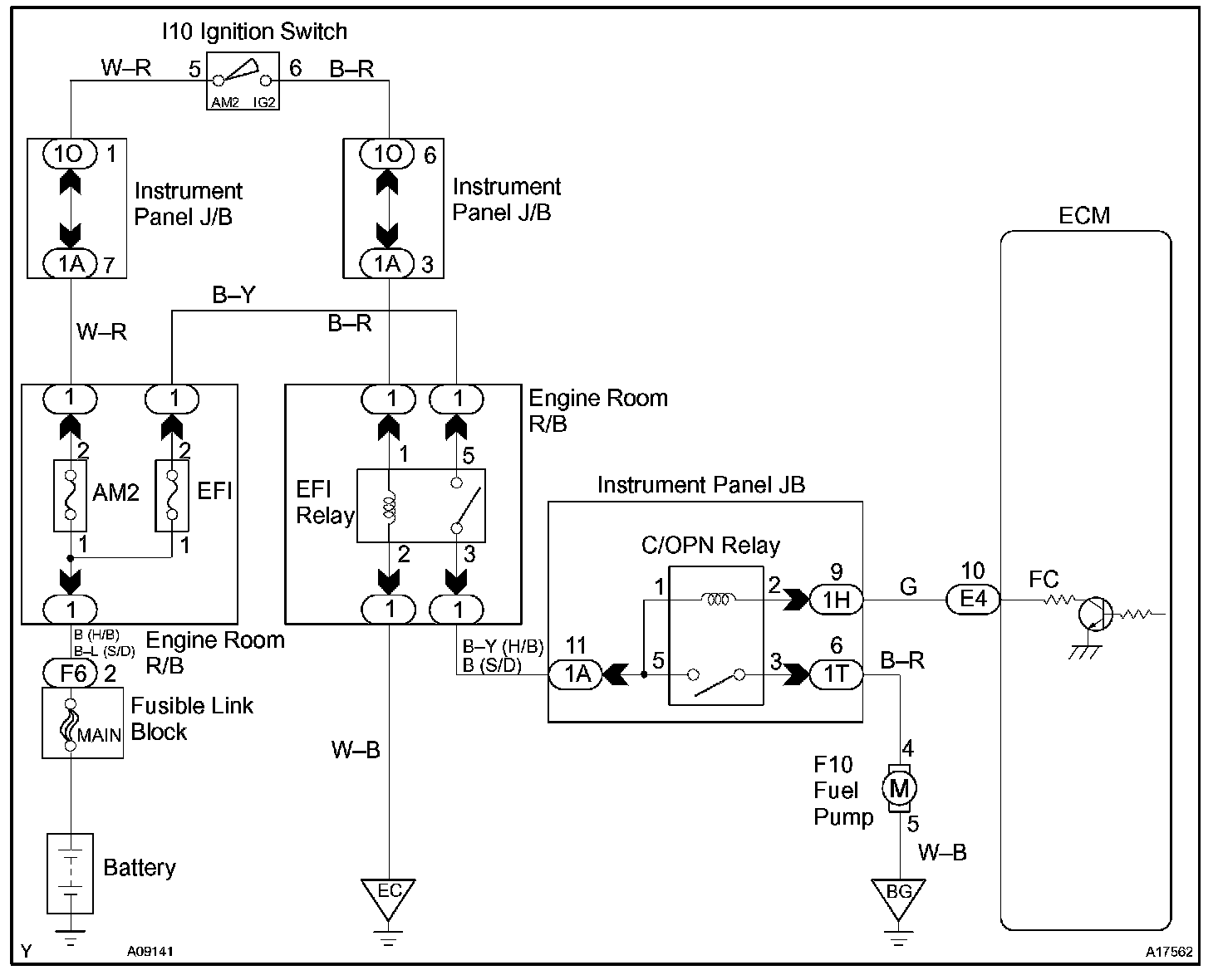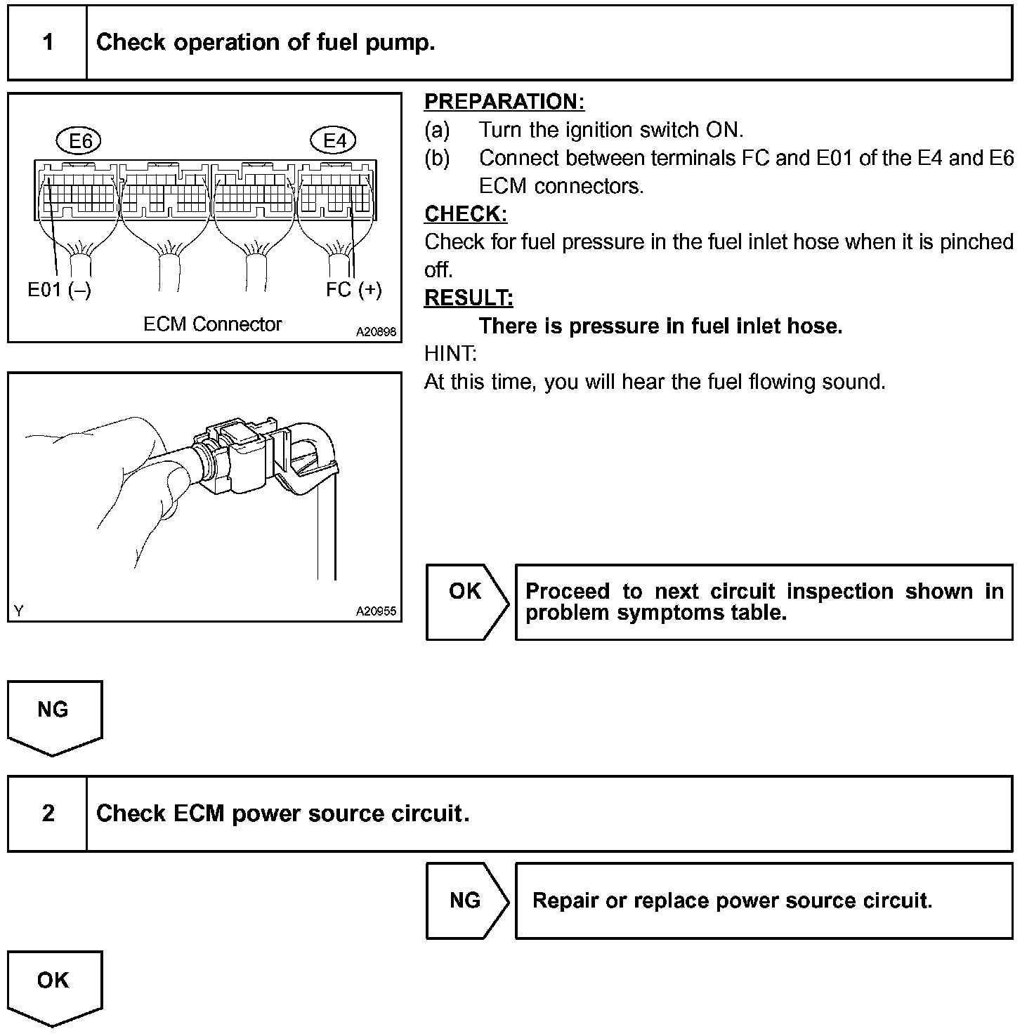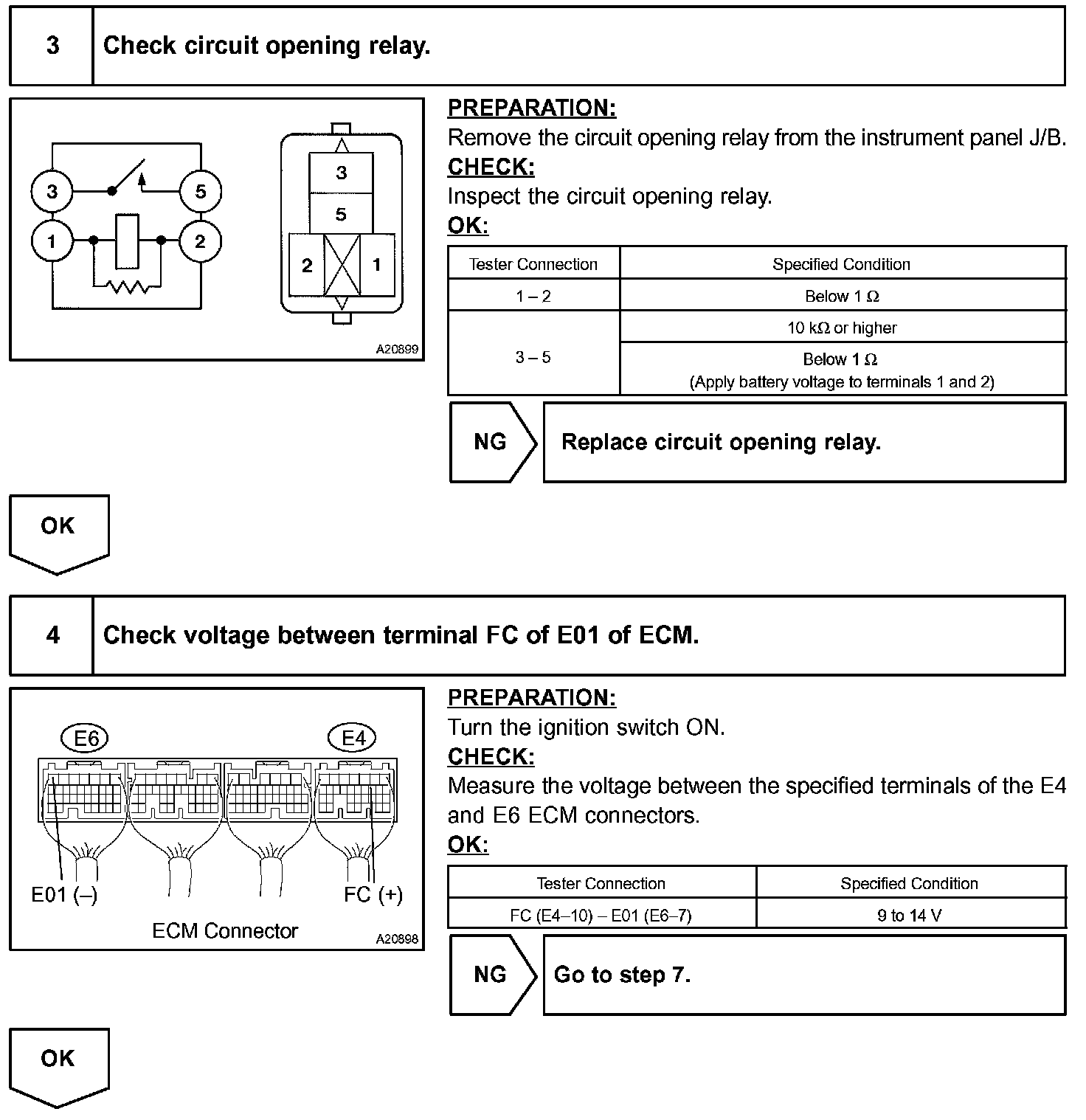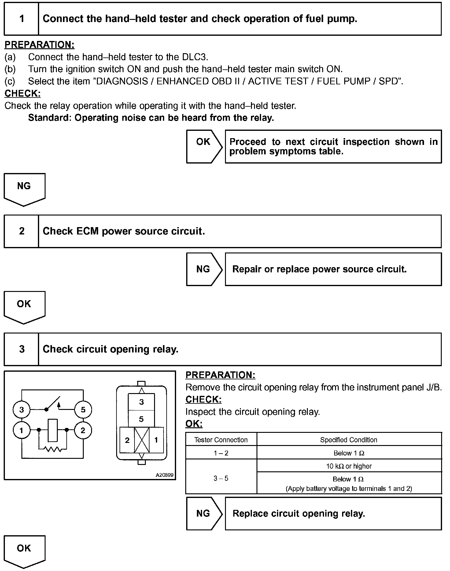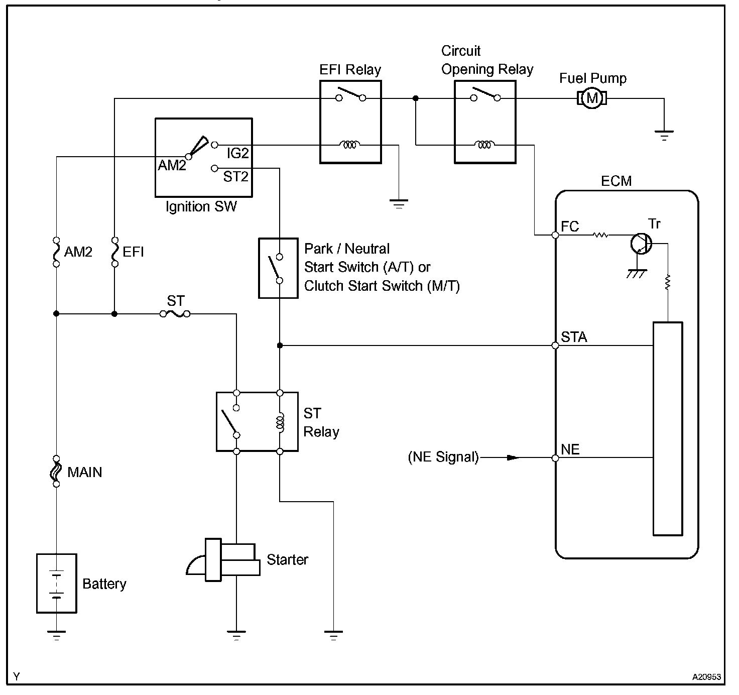 When the STA signal and NE signal are input to the ECM, Tr is turned ON, current flows to the coil of the circuit opening relay, the relay switches on, power is supplied to the fuel pump and the fuel pump operates. While the NE signal is generated (engine running), the ECM keeps Tr ON (circuit opening relay ON) and the fuel pump also keeps operating.