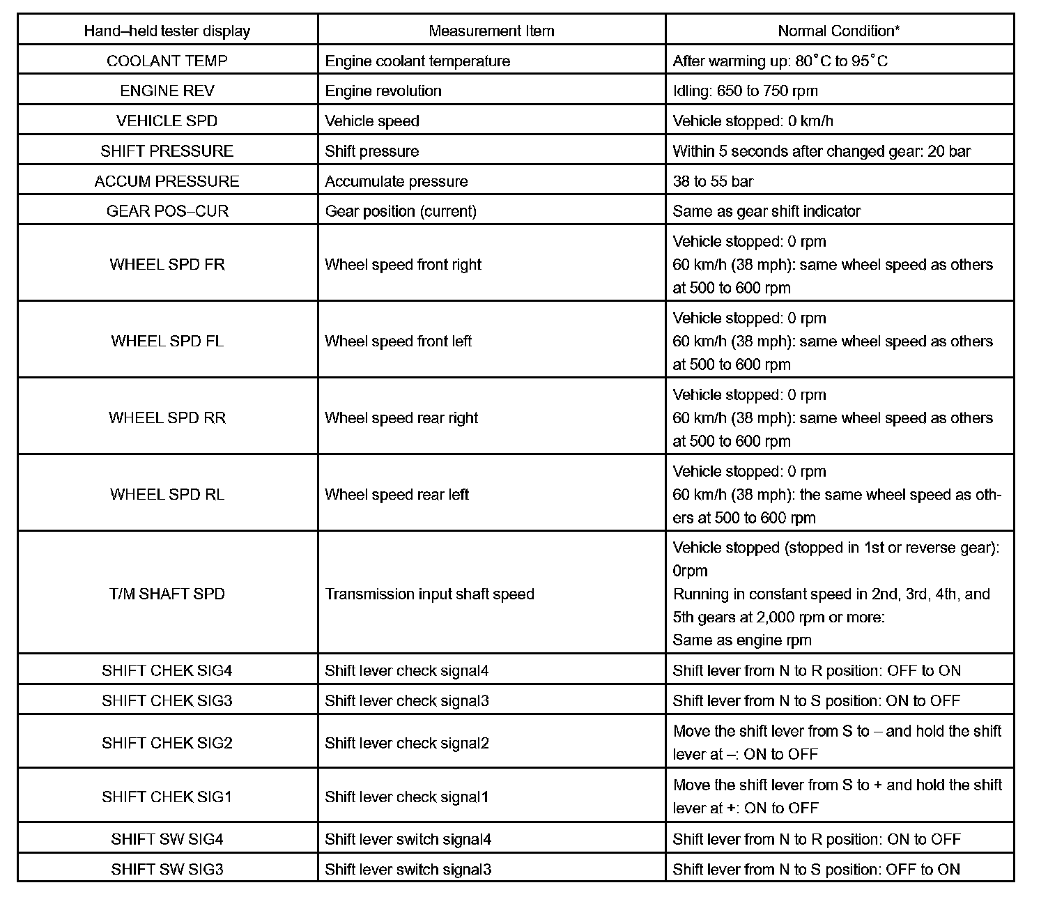 SEQUENTIAL MANUAL TRANSMISSION OPERATING CONDITIONNOTE: The values given for "Normal Condition" are reference values only. A vehicle may still be normal even if its value differs from those listed. Do not depend solely on the "Normal Condition" column when deciding whether a part is faulty or not.