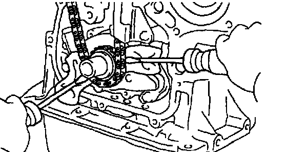 a. Remove the timing chain with the crankshaft timing gear prying screwdrivers as shown in the illustration.