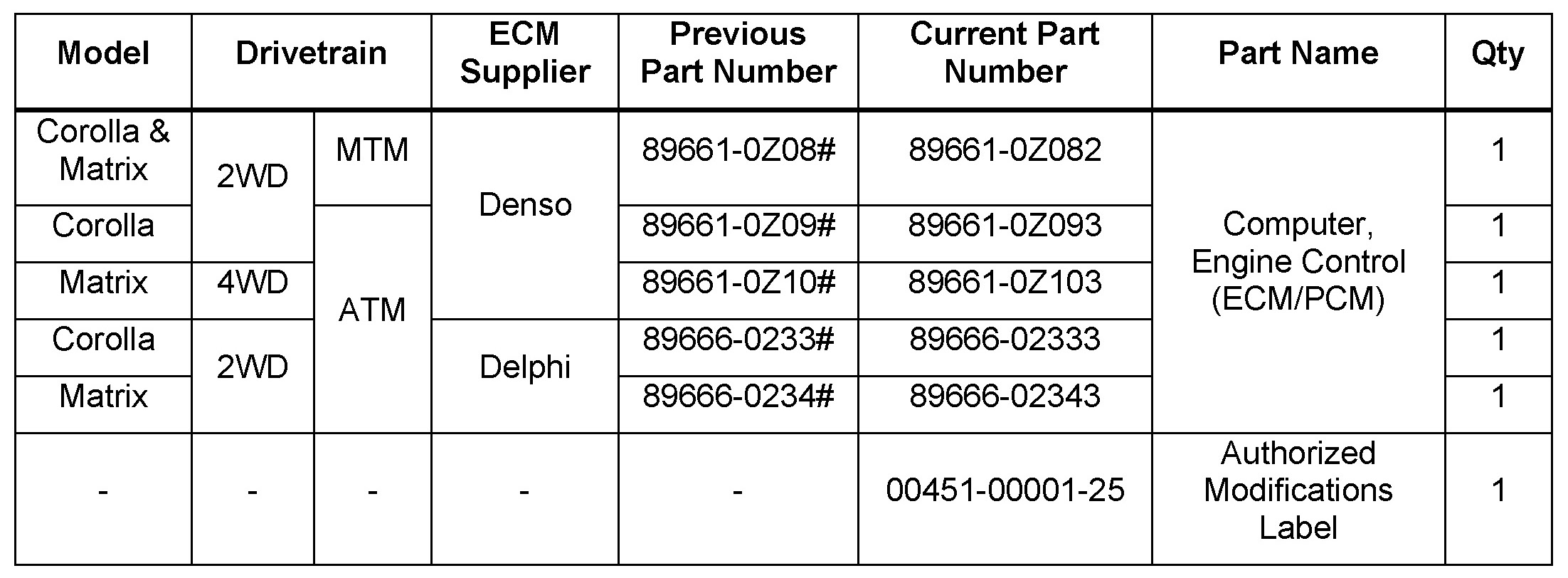 - 2004 model year Corolla and Matrix vehicles.